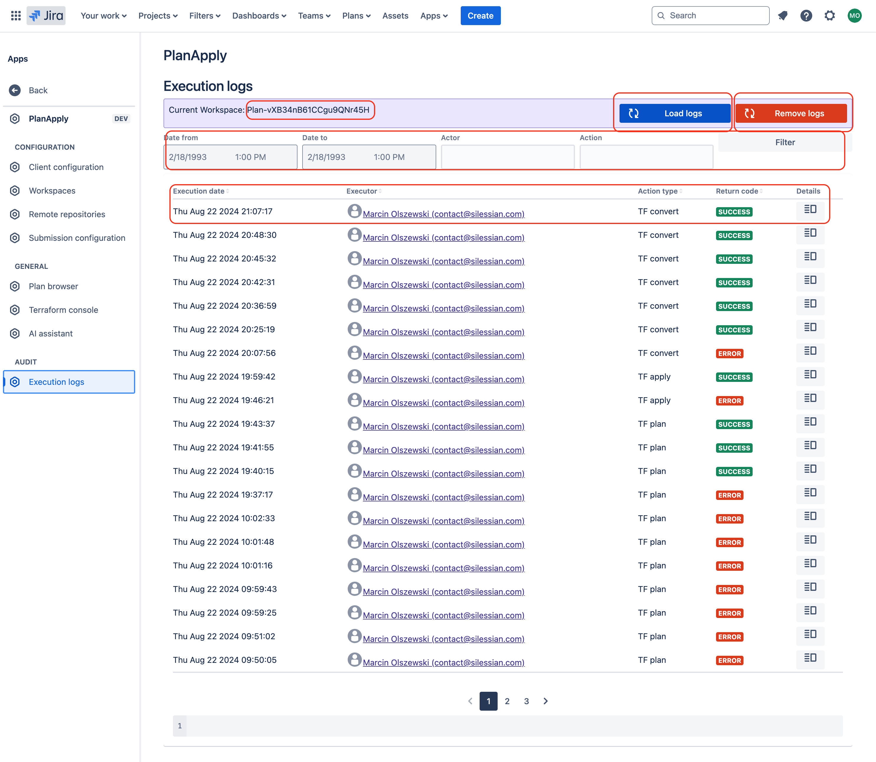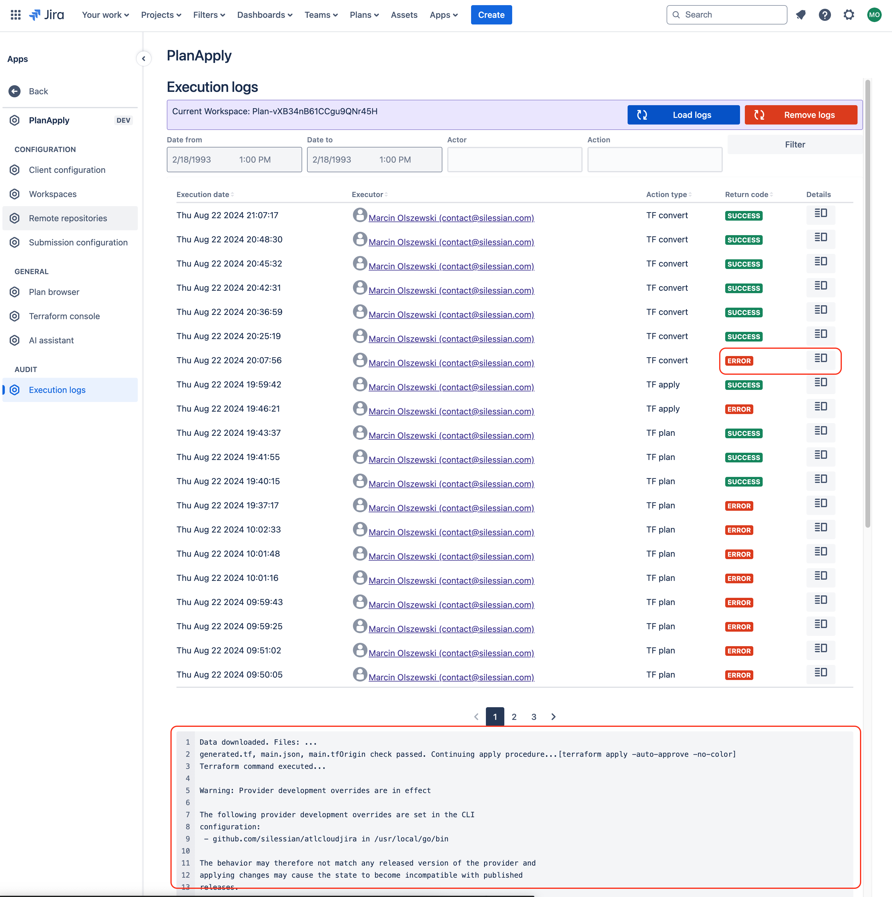 Execution logs page contains are executions performed in Terraform console and Remote repositories over given workspace. You need to first select desired workspace in Workspaces page.