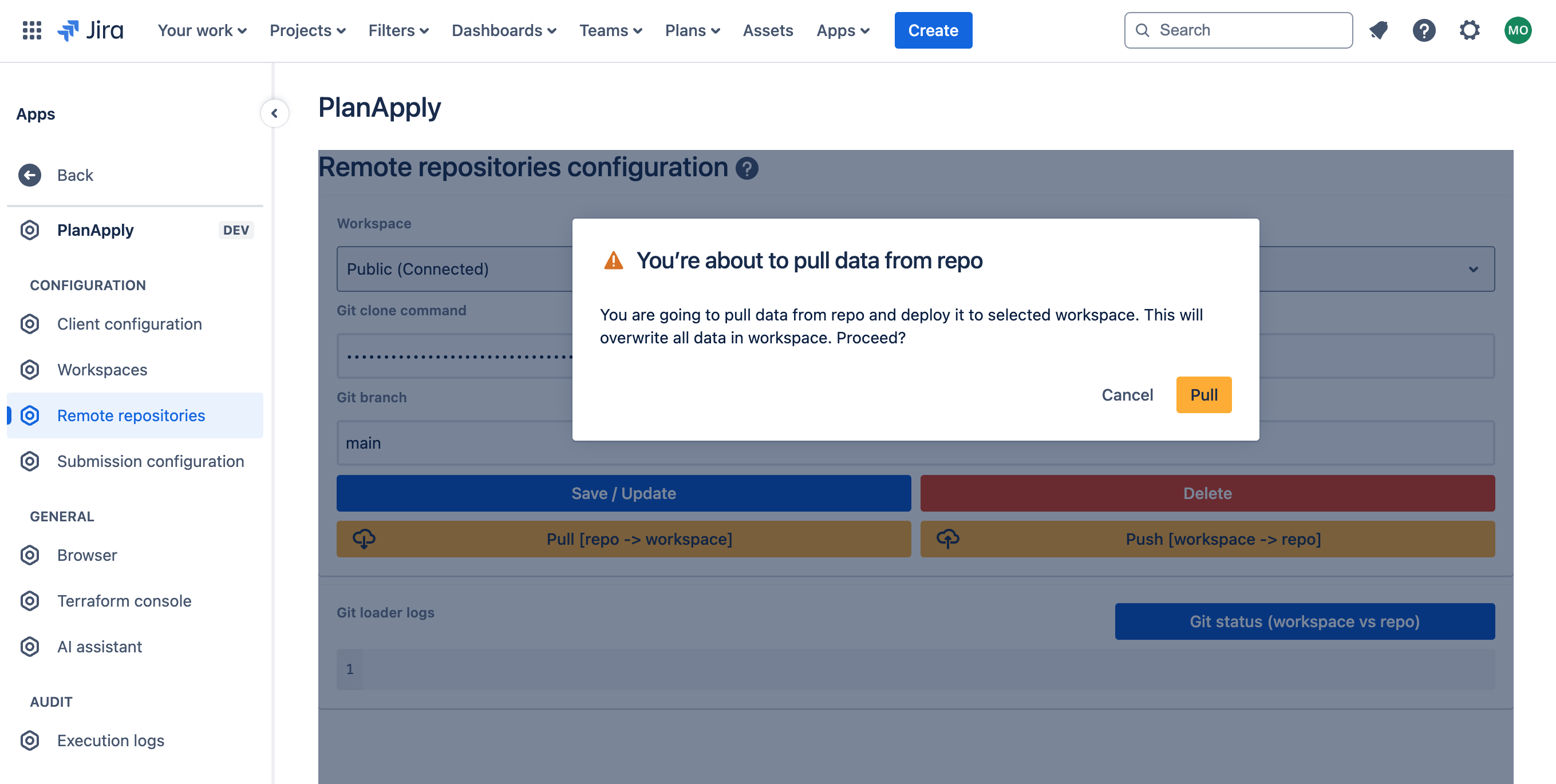 Pull operation will replace all data inside given workspace. Files would be added / removed. By clicking "Pull" button inside dialog you are confirming the operation.&#x20;