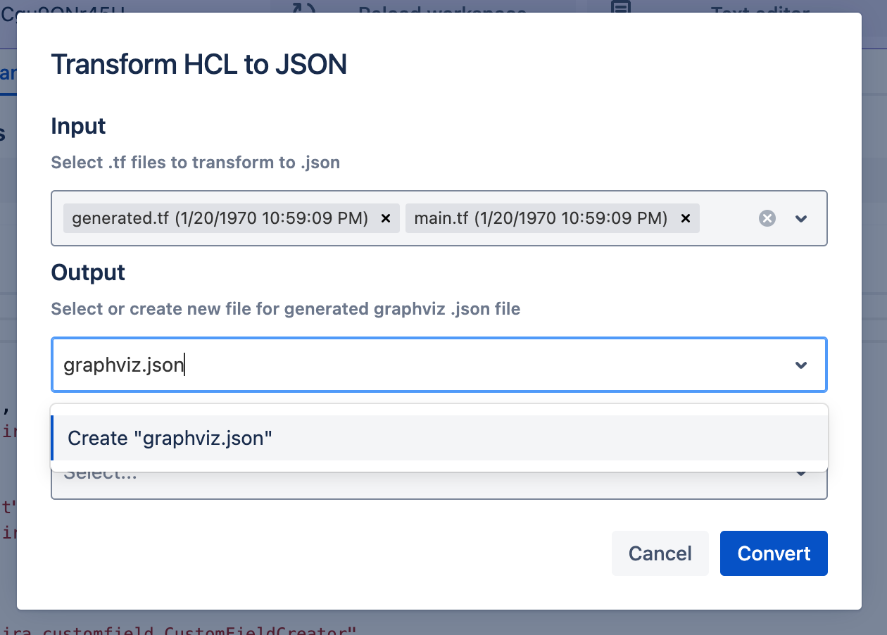 <figure><img src="https://2582686426-files.gitbook.io/~/files/v0/b/gitbook-x-prod.appspot.com/o/spaces%2Fn7nTpq2xv8EGbzULdTCb%2Fuploads%2FKgBxWuZMBd5Dn1qGwzsn%2FTransform-Hcl2Json1.png?alt=media&#x26;token=a2359b1f-590d-4454-b0d8-2694250e6538" alt=""><figcaption><p>Select all Terraform files to convert. Type new or use existing file to store Graphviz JSON data.</p></figcaption></figure>