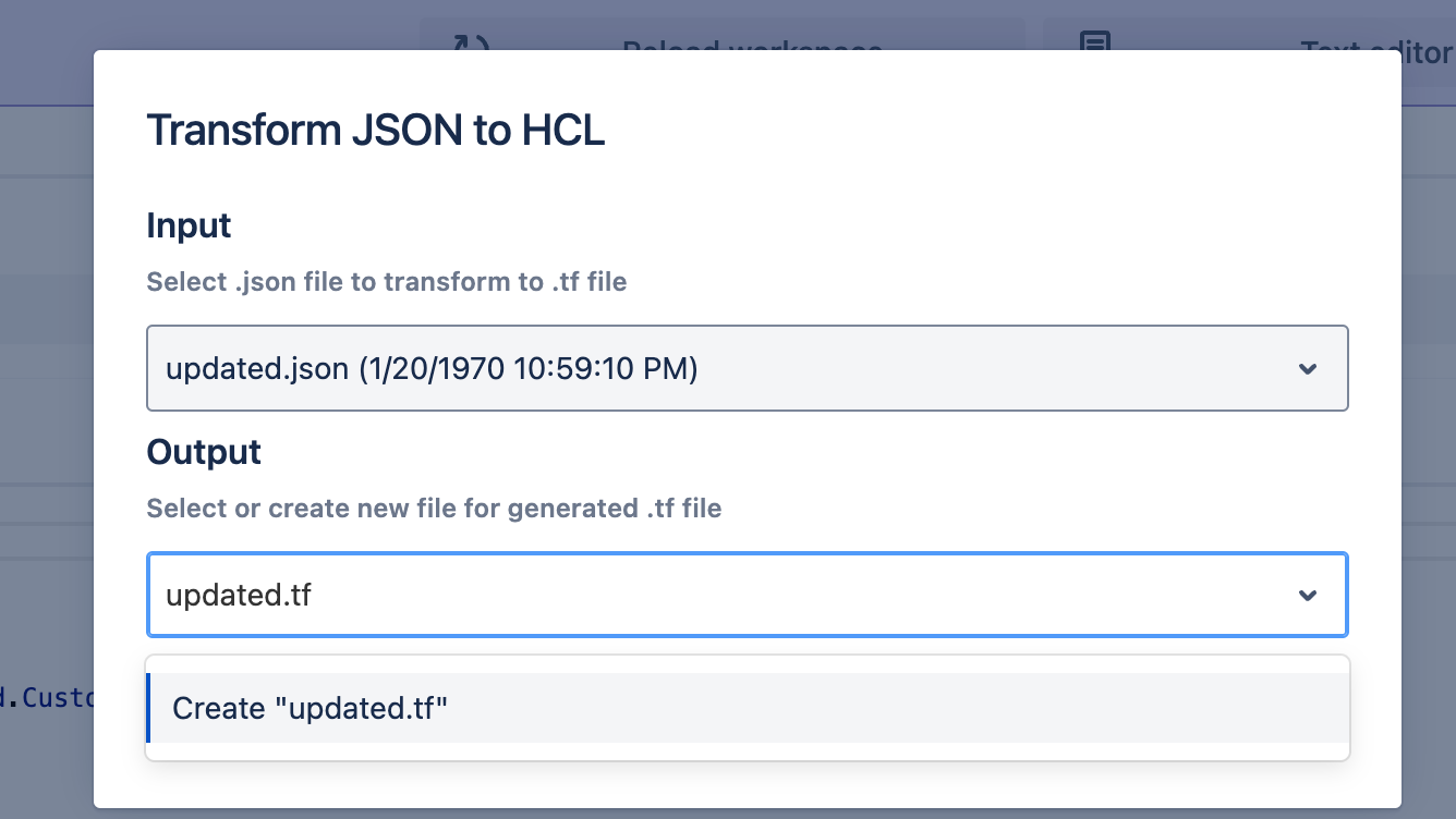 <figure><img src="https://2582686426-files.gitbook.io/~/files/v0/b/gitbook-x-prod.appspot.com/o/spaces%2Fn7nTpq2xv8EGbzULdTCb%2Fuploads%2FtzaxbVNpqVKLyMCtGpd7%2FTransform-Json2Hcl1.png?alt=media&#x26;token=9b3ac70f-6b97-448e-980e-ffd957c69074" alt=""><figcaption><p>Select JSON file to convert into Terraform code. Create new or select existing file as an output.</p></figcaption></figure>
