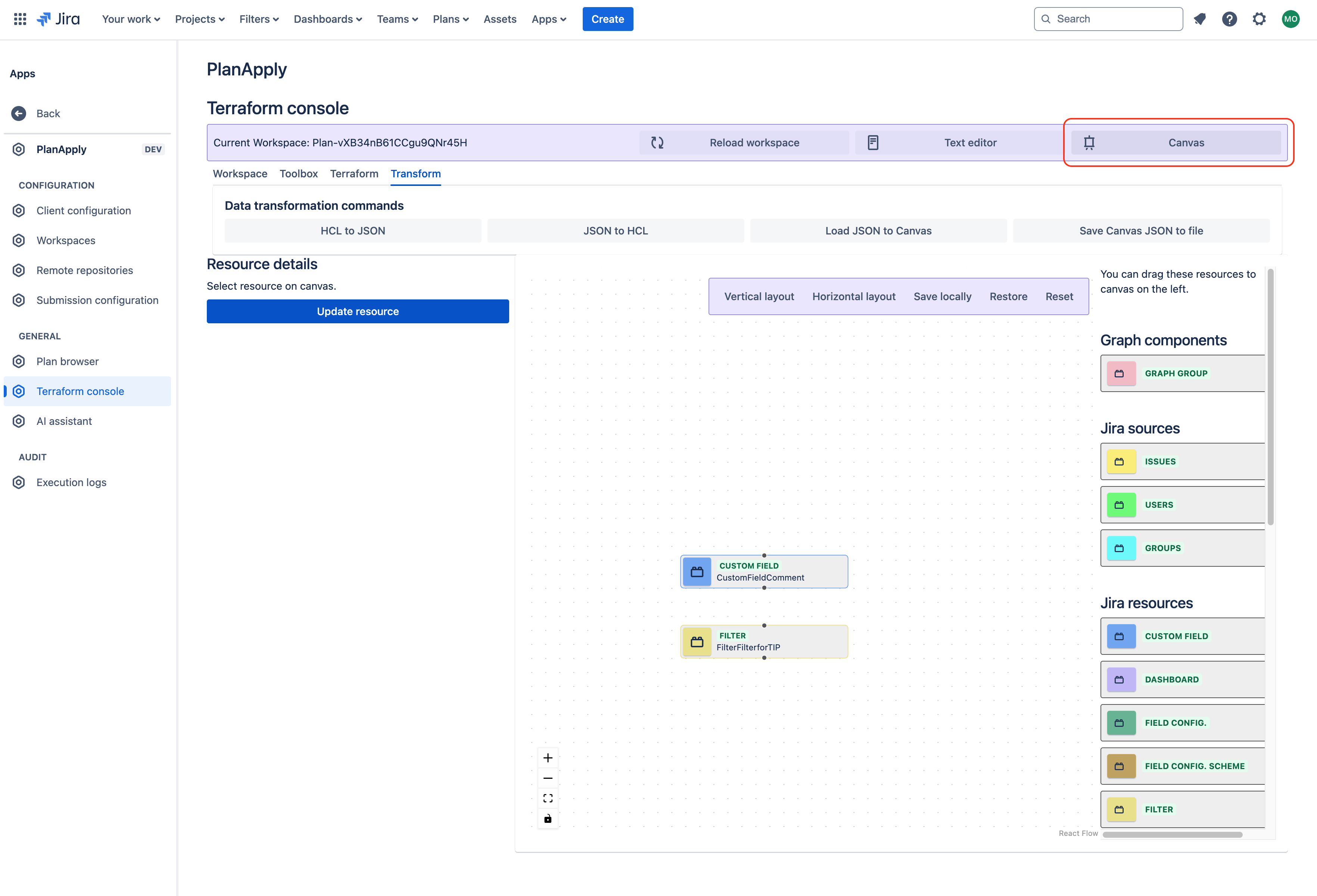 Transform tab is used to transform Terraform code into diagrams that can be presented on interactive Canvas. Operation can also be reversed.