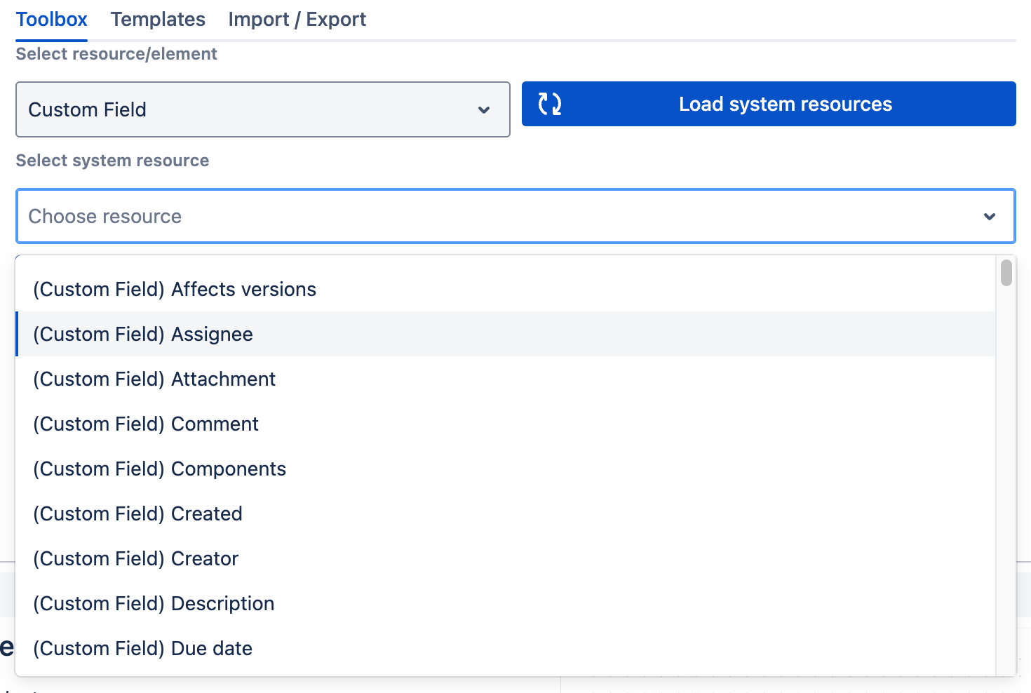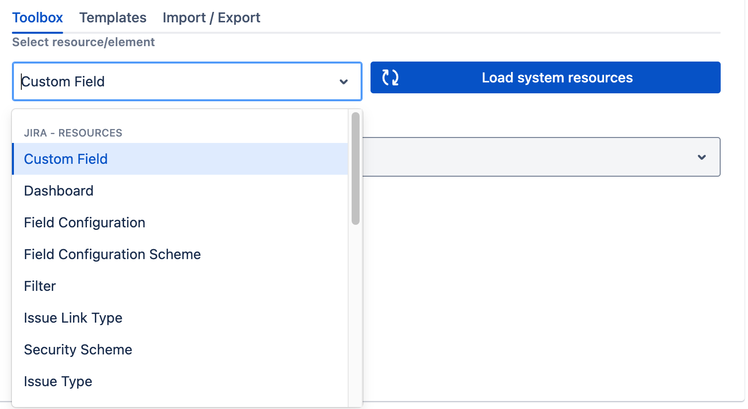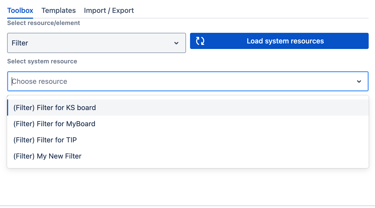 <figure><img src="https://2582686426-files.gitbook.io/~/files/v0/b/gitbook-x-prod.appspot.com/o/spaces%2Fn7nTpq2xv8EGbzULdTCb%2Fuploads%2FdR8mMaAfpIhcNCG5JxcL%2FToolbox1.png?alt=media&#x26;token=3769afa2-12be-4126-a6f4-73d42e122da9" alt="" width="375"><figcaption><p>Select resource type and click on button to load resources.</p></figcaption></figure>